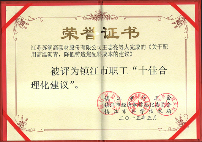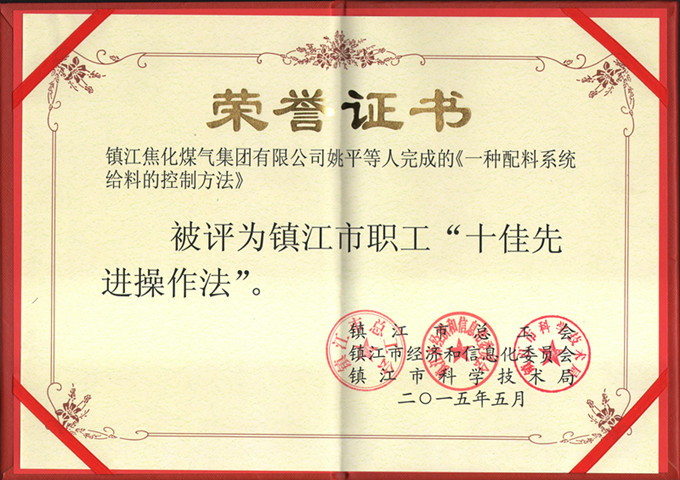 我公司在鎮江市職工“十佳先進操作法”和“十佳合理化建議”評選中,分別獲得表彰。